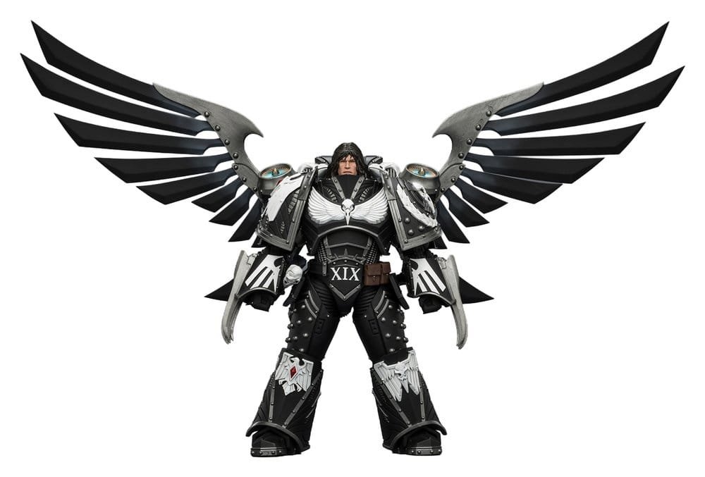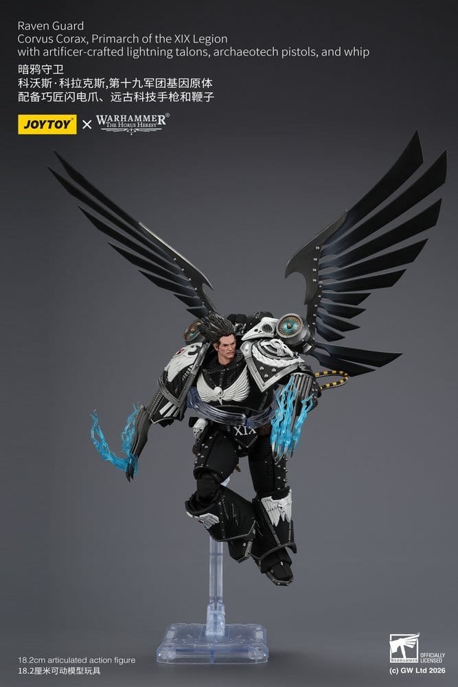 El líder Raven Guard Corvus Corax, Primarch of the XIX Legion, es lanzado por Joy Toy como figura de acción de Warhammer 40,000. A escala 1/18 y con 18,2 cm de altura, la figura de plástico está totalmente articulada e incluye garras de rayo forjadas por artífices, pistolas arqueotecnológicas y un látigo.