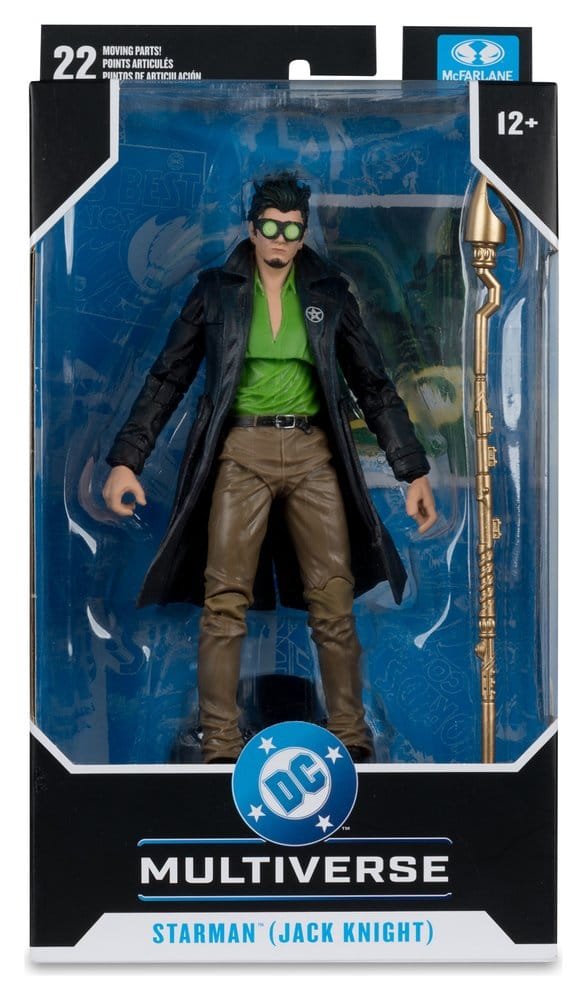 La figura de 18 cm de Starman (Jack Knight) pertenece a DC Multiverse de McFarlane Toys. Con Ultra Articulation y 22 partes móviles, incluye el bastón cósmico, una base y una tarjeta coleccionable. Inspirada en los cómics, muestra a Jack como protector de Opal City.