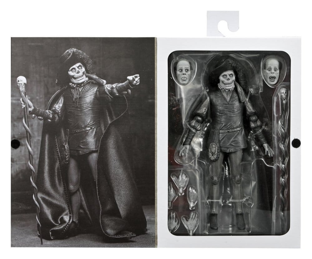 NECA conmemora el 101º aniversario de la película muda El fantasma de la ópera (1925) con esta figura de acción en blanco y negro del Fantasma en su disfraz de “Muerte Roja” del baile de máscaras. A escala de 7 pulgadas (17,8 cm), incluye capa de tela suave, sombrero de ala ancha, accesorios de bastón de calavera, y múltiples cabezas y manos intercambiables con otras figuras de la misma línea (se venden por separado). Se presenta en una caja apta para coleccionistas con solapa frontal.